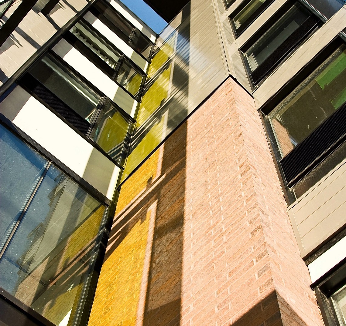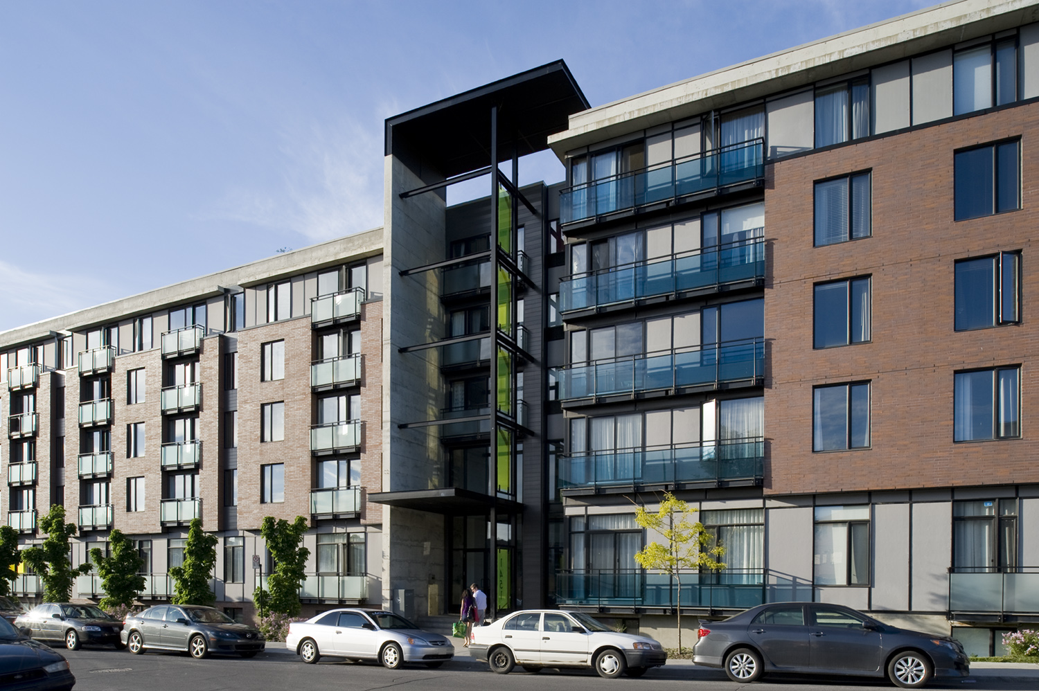 Ce bâtiment affiche des lignes résolument modernes et une fenestration généreuse. Sur le plan du design intérieur, les plafonds de béton apparent et les panneaux coulissants qui divisent les espaces insufflent une allure urbaine et aérée à ces copropriétés. Le projet comprend plusieurs unités sur deux niveaux et les unités des derniers étages comportent une mezzanine et une terrasse sur le toit.